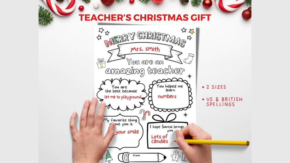 Here is Printable coloring card/sheet for kids to fill in for their teachers Christmas gift. Simply print and color/fill in. You can add this heartfelt and kid made gift to any teacher gift, attach a gift card or put in an envelope (for 5x7 sizes).